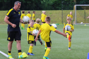 Das Programm gestaltete sich in den vier Tagen sportlich und abwechslungsreich. Gleich zu beginn des ersten Tages nahmen die Kids nach der Begrüßung durch die BVB-Trainer aufgeregt ihre nagelneue schwarzgelbe Trainings-Kluft entgegen. Unter dem Motto „Vollgas wie die Profis!“ ging es anschließend aufgeteilt in 5 altersgerechte Gruppen direkt auf den Bruchhauser Kunstrasen. Unter Anleitung der fünf hochqualifizierte Trainer von Borussia Dortmund standen professionelle Trainingseinheiten rund um den Fußball auf dem Programm. Schwerpunkte setzten die Übungsleiter bei wichtigsten Techniken wie Dribbling, Tricks, Torabschlüsse, Passspiel und Ballmitnahme, wobei vor allem der Spaß am Sport im Mittelpunkt stand.