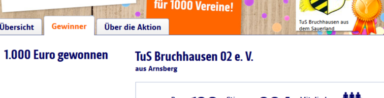 30. Juni 2015 TuS Bruchhausen gewinnt zum dritten Mal 1.000 € Die Tusler haben es wieder geschafft. Bei der Aktion „1.000 x 1.000“ der ING-Diba gewinnt der TuS Bruchhausen zum dritten Mal in Folge 1.000 Euro. Mit insgesamt 994 Stimmen landete der TuS 02 auf dem 128. Rang. Die 200 bestplatziertesten Vereine wurden jeweils mit 1.000 € premiert. Die Spende der ING-Diba fließt komplett in die […]