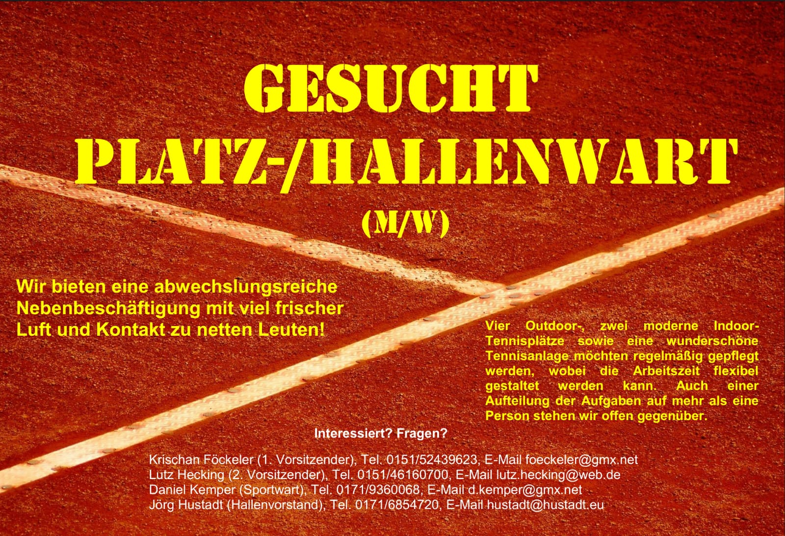 Die Tennisabteilung und die Hallenbaugemeinschaft der Tennishalle suchen einen Platz- und Hallenwart…